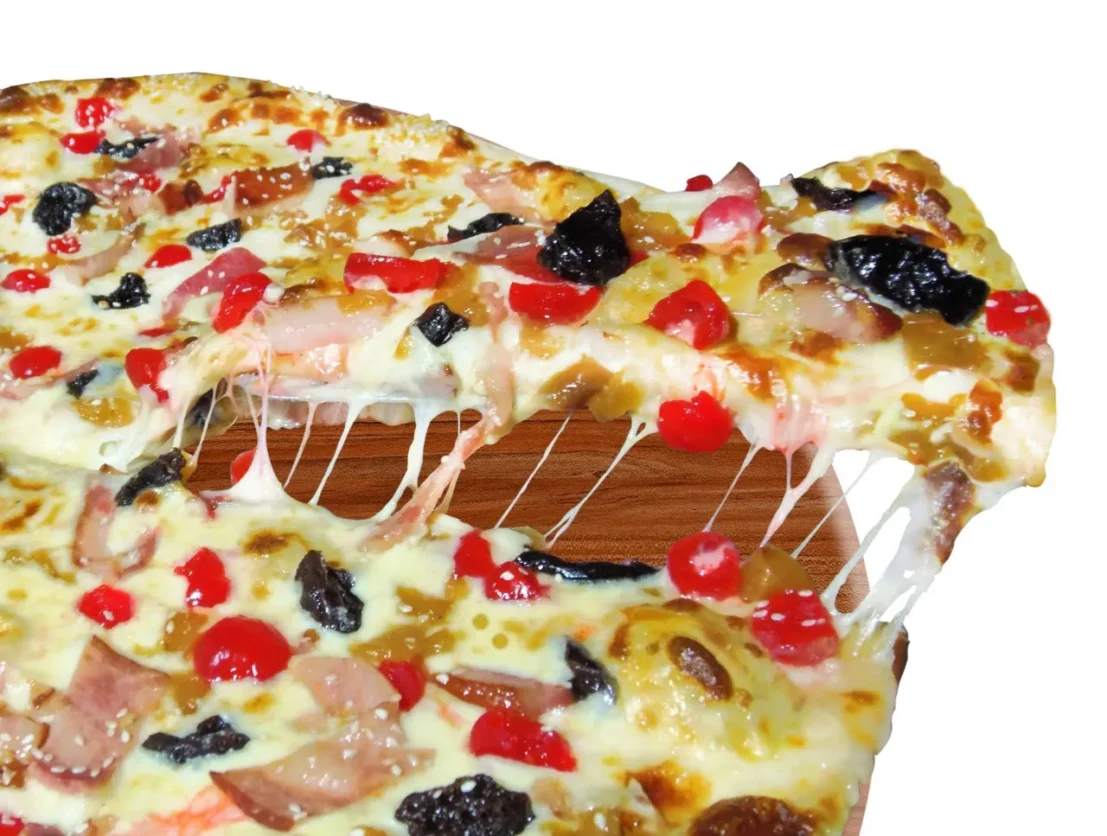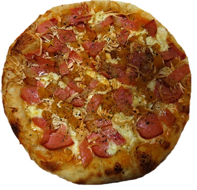 Base napolinata, Queso Mozzarella, Jamón, Pollo, Piña en almibar, Tocineta, Queso pecorino, Especias, Aceite de oliva