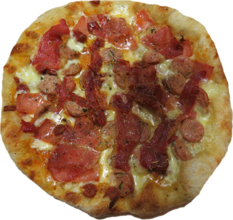 Base napolinata, Queso mozzarella, Jamón, Chorizo, Cabano, Queso pecorino, Especias, Aceite de oliva