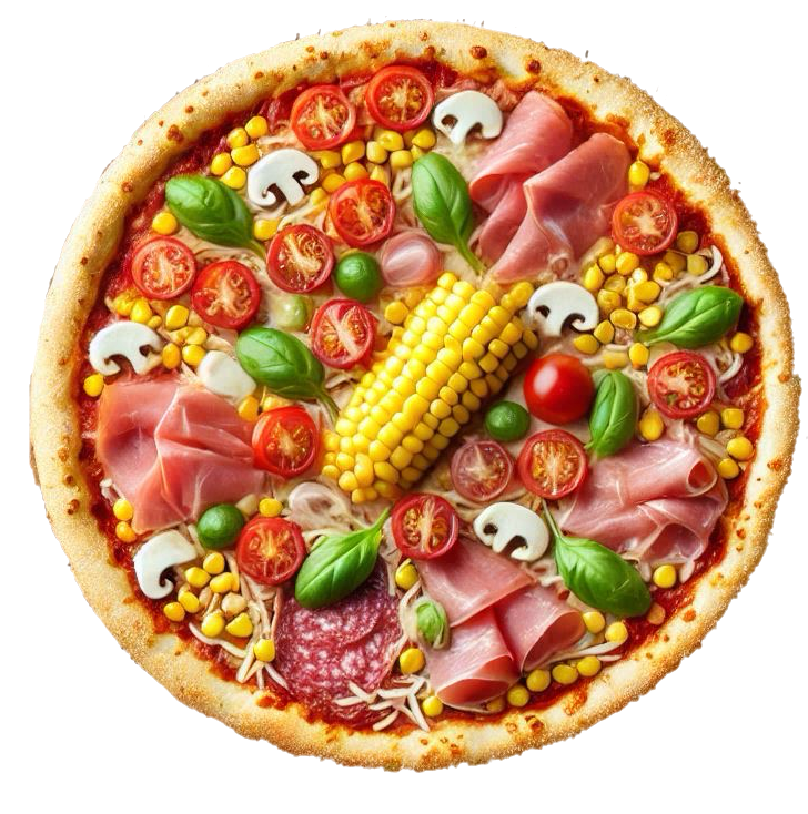 Base napolinata, Queso mozzarella, Tomate cherry, Cebolla, mazorca, prosciutto, Queso pecorino, Especias, Aceite de oliva