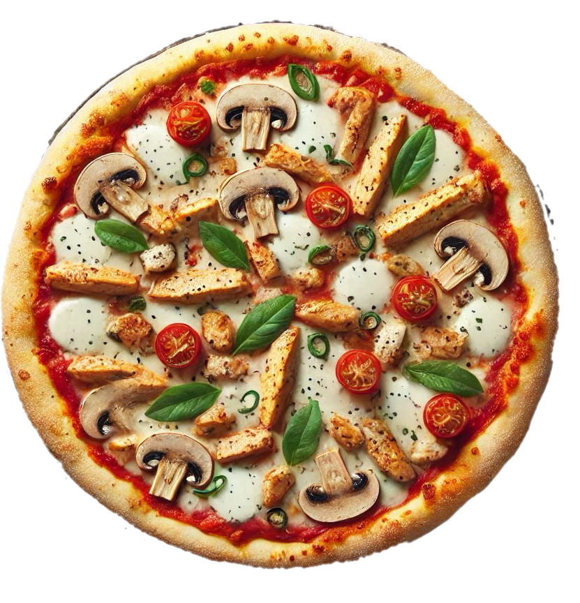 Base napolitana, Queso mozzarella, Pollo, Champiñones, Queso pecorino, Especias, Aceite de oliva