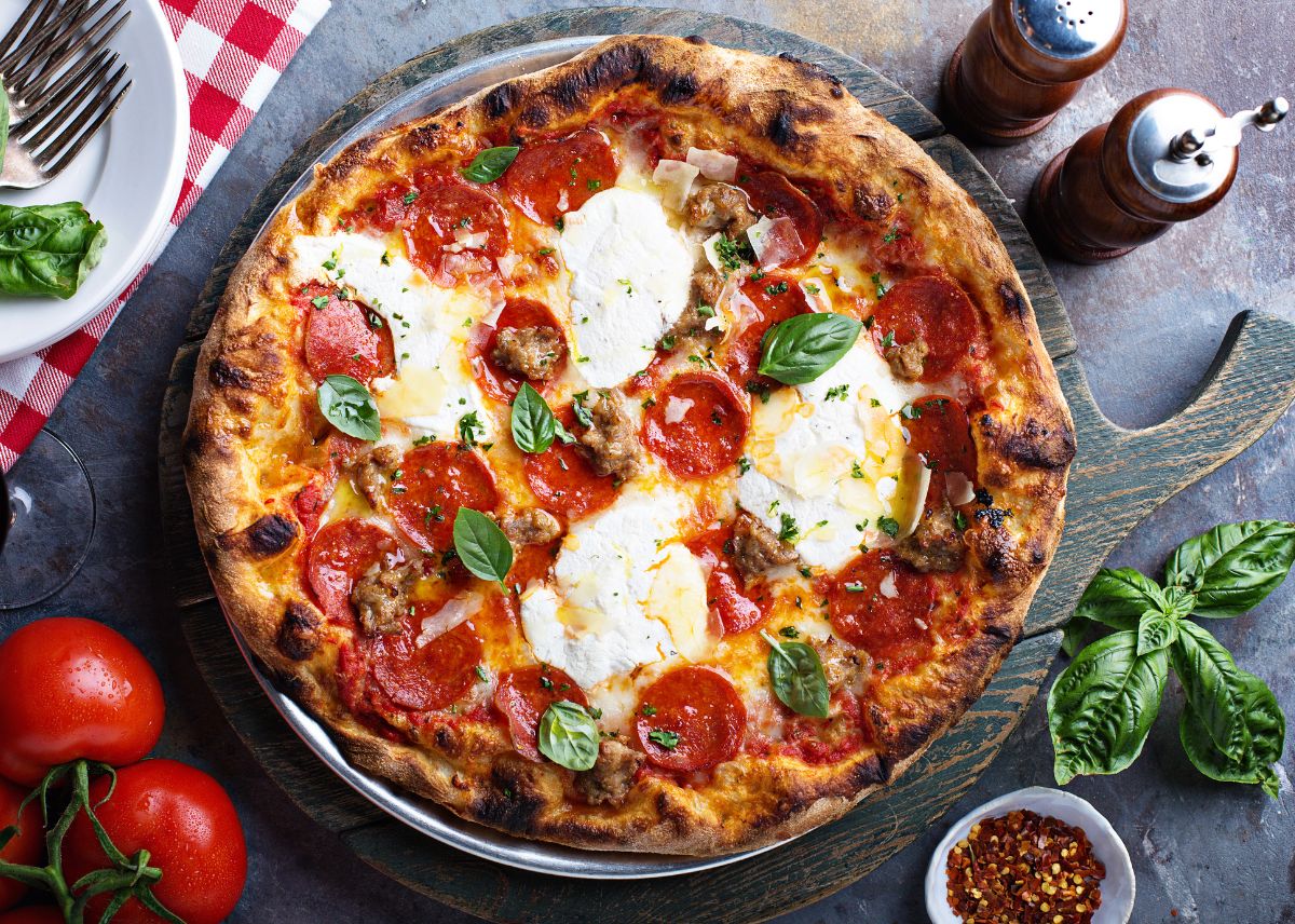 Base napolinata, Queso mozzarella, Jamón, Chorizo, Cabano, Prosciutto, Queso pecorino, Especias, Aceite de oliva